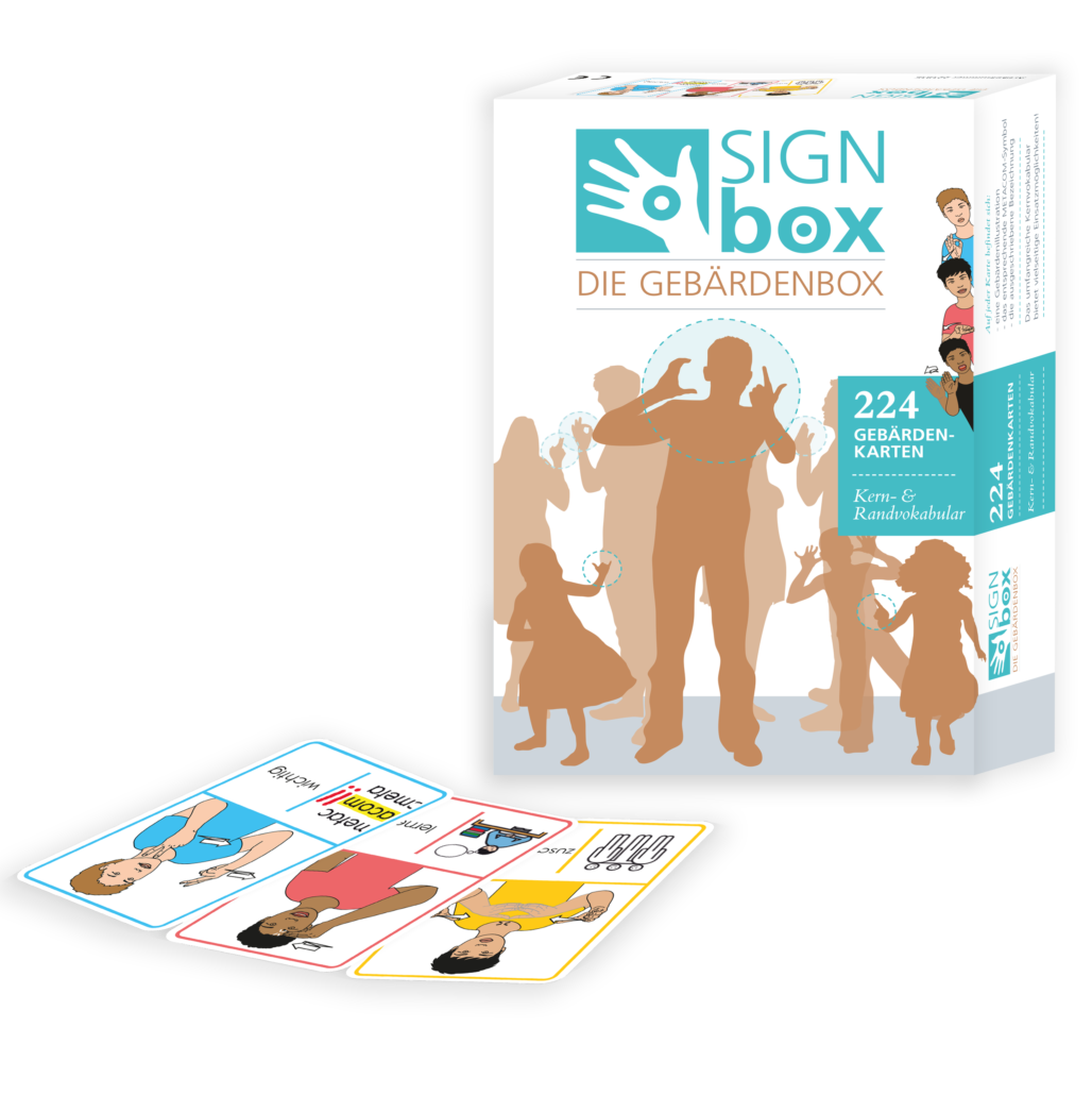Auf den Karten der SIGNbox werden Gebärden und Piktogramme kombiniert. Das ermöglicht eine multimodale Kommunikation in verschiedenen Alltagssituationen (z. B. beim Spielen in der Kita, im Unterricht in der Schule, am Arbeitsplatz oder beim Frühstück zu Hause).